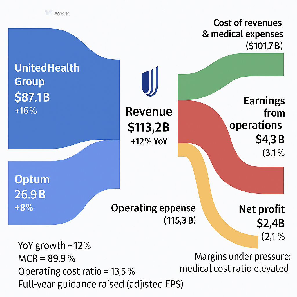 Total Revenue: $113.2B (+12% YoY)- UnitedHealthcare: $87.1B (+16% YoY)- Optum: $69.2B (+8% YoY)